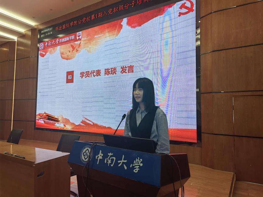 计算机D2202班陈琰同学作为学员代表发言。她代表全体学员郑重承诺,将以最饱满的热情、最全面的投入、最实际的行动来完成此次入党积极分子培训班学习,并以此为开端,在今后的学习生活中继续坚定理想信念,主动加强政治学习,在思想上和行动上同党中央保持高度一致。