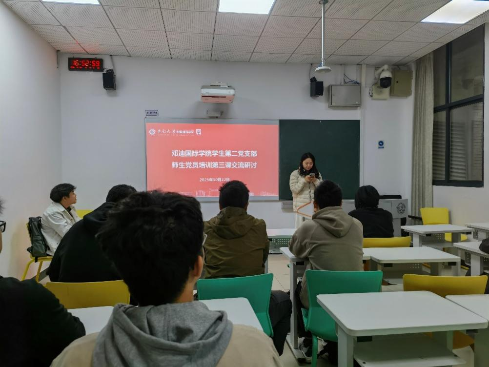 2025年10月22日下午,邓迪国际学院党总支组织全体师生党员分4个会场开展师生党员基本培训第三课,集中学习观看了由教育部党组书记、部长怀进鹏主讲的题为“深入学习贯彻习近平总书记关于教育的重要论述,以教育强国支撑引领中国式现代化”的专题党课。