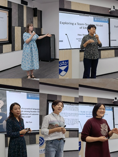 英语教研组组长Charlotte Mahoney探讨了在跨文化背景下如何展开科研合作,引导学生有效学习。外国语学院副院长侯先绒教授和谢芸、张弢、邓军三位副教授对其期待的科研合作话题进行了讲解,包括针对邓迪国际学院学生如何开展中外师资联合授课、线上线下混合授课,如何更好地发挥英语外教的作用等。