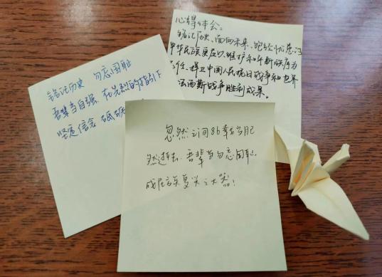 活动结束前,团支书们组织大家为在战争中牺牲的同胞们留言,寄托哀思与悼亡之情。“忽然之间八十六载岁月已然逝去,吾辈当勿忘国耻,成民族复兴之大器”,“国行公祭,祀我殇胞,珍爱和平,勿忘国耻”,拳拳怀思揉进象征着祝福的千纸鹤中,为牺牲的同胞祈福。泛黄的纸条上,写不尽的是对同胞们最沉痛的哀悼。