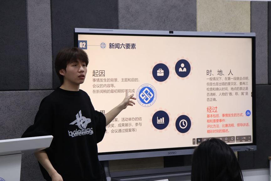培训主要分为新闻稿要素、写作目的和技巧、案例分析三个部分。主讲人首先从新闻稿的构成出发,介绍了新闻稿必须具有的六个核心要素,即事情发生的时间、地点、人物以及起因、经过、结果;从新闻稿的性质方面,他提出了新闻表达应具有的真实性、时效性、新鲜性三大基本性质,并着重强调了应提前准备文章结构与大纲、活用热词和排比等来保证时效性、新鲜性两大要点。随后,主讲人通过剖析不同场景的写作目的,带领同学们思考并总结出不同的写作技巧:如报道特色活动应抓住网络热点、特殊节庆日和化用诗句,成绩展示应简洁有力,会议记录则要聚焦于开展形式与主题、重要结论与讲话和总结三个部分等。最后主讲人通过具体案例展示与分析,加深了同学们对以上内容的印象,帮助他们更好地掌握本次培训的要点。