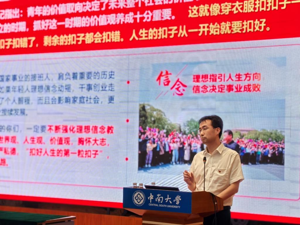 会议伊始,高东波从自身经历出发,提醒同学们应专心学习、不懈奋斗,以“扣好第一粒扣子”为主线,从坚定理想信念、严守纪律规矩、勇于担当奋斗三个方面,提醒新生应树立正确的三观,要坚定不移听党话跟党走,坚守纪律底线,做一名合格的中南人。此外,高东波还列出了优秀中南榜样以及反面警示案例,希望同学们能借此自我鞭策、自我约束。
