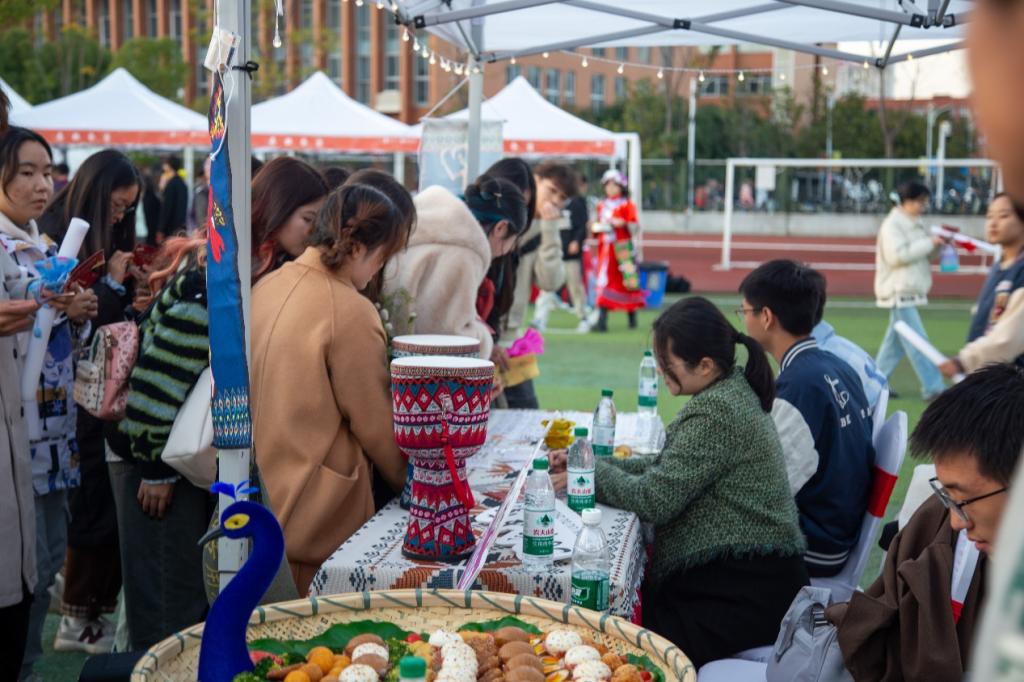 同时,展点上的特色活动“傣文记认”吸引了众多参与者,大家通过识记傣族文字赢取奖品,加深了对傣族文化的了解。此外,鲜花饼及“孔雀开屏”小吃盘也备受青睐,同学们争相品尝傣族美食,赞不绝口。