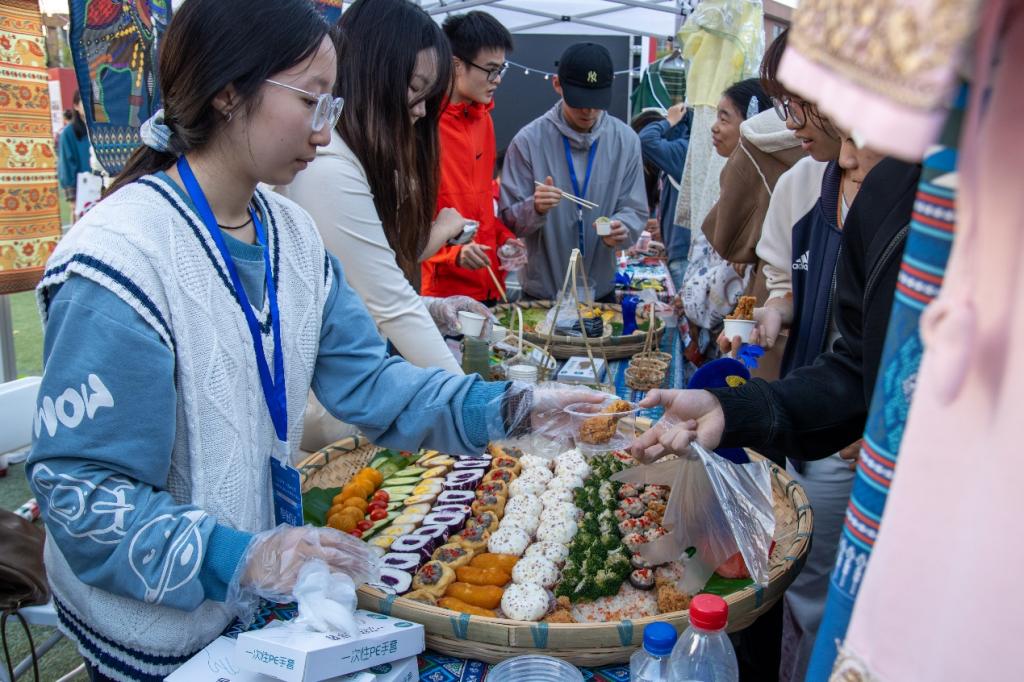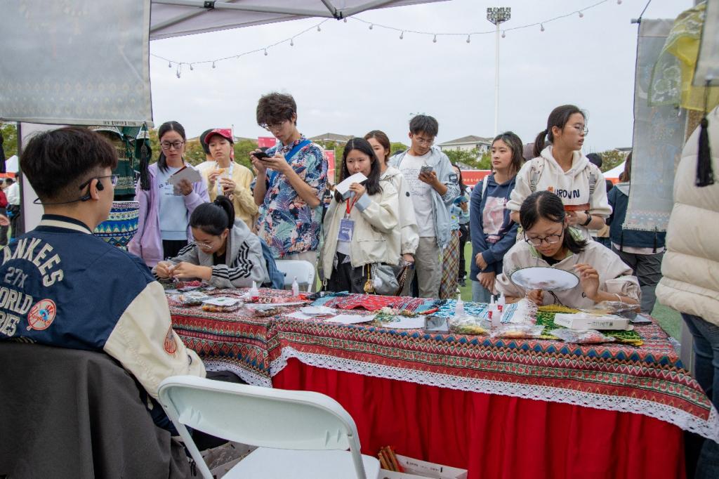 潇湘校区体育场副场正式开始。邓迪国际学院所承办的傣族展位以“活力傣韵”为主题,通过沉浸式体验与互动式展示,让师生们近距离感受到傣族文化的独特魅力。
