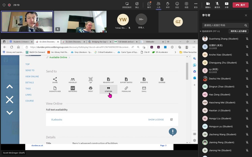 2023年3月1日下午17:00,来自邓迪大学的Scott McGregor老师为邓迪国际学院全体新生讲解了图书馆线上资源的获取方式和使用方法,100余名同学参与了此次培训。首先,Scott McGregor老师展示了如何从邓迪大学官网进入电子图书馆,并介绍了电子书籍的浏览检索方式,以及电子期刊杂志的下载方法和管理规定。随后,Scott McGregor老师讲述了如何在学术文章中正确引用他人的著作,并指导学生借助图书馆网站中的引用功能(Citation),...